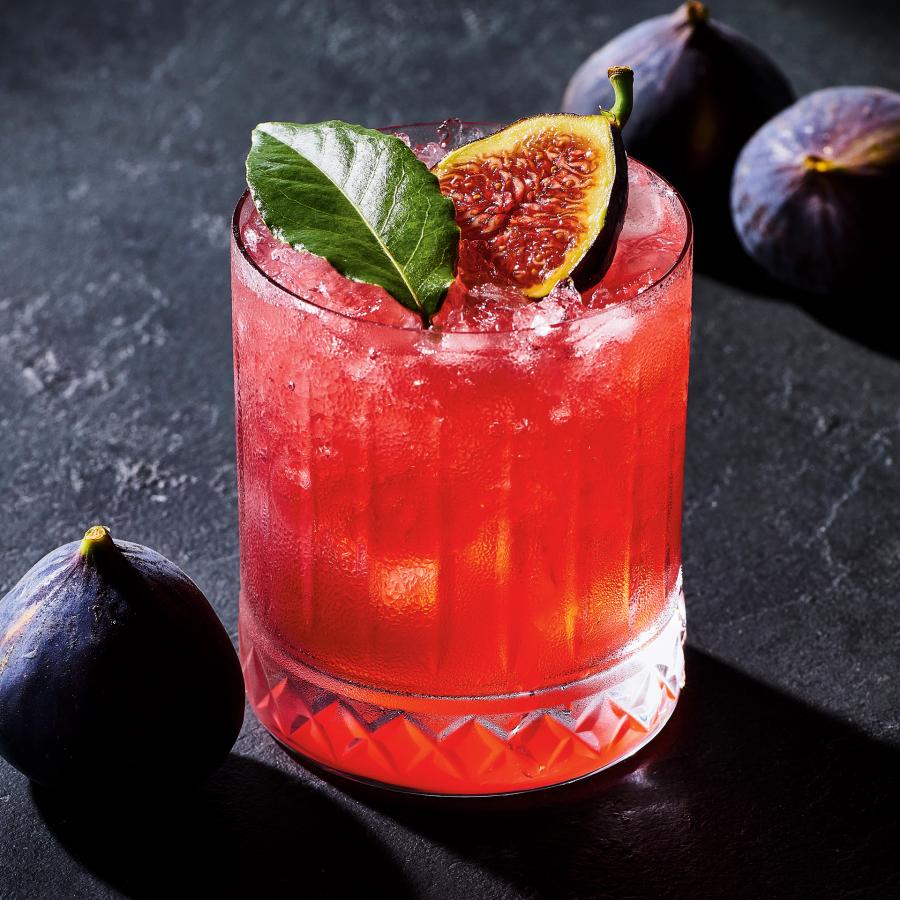 Mixez tous les ingrédients avec de la glace pilée. Servez dans un verre bas, décoré d’une tranche de figue.
