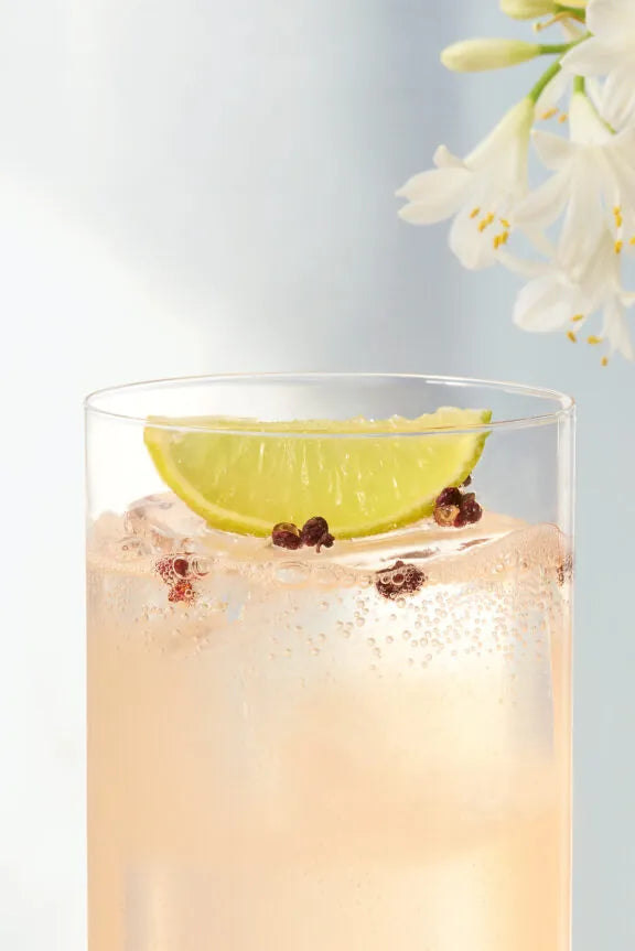 Shakez avec glaçons, filtrez, allongez à l’eau gazeuse. Garnissez d’un tour de moulin de poivre rose.