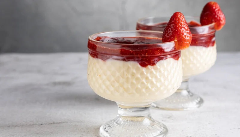 Au moment de servir, nappez d'un filet de sirop de fraise et de morceaux de fraises fraîches.
